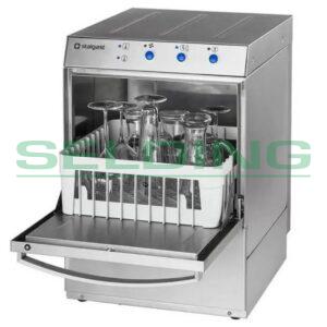 Glāžu mazgājamā mašīna izgatavota no AISI 304 nerūsējošā tērauda, mašīnas ražība 30 grozi / stundā. Mašīnas ārējie izmēri 436x495x670 mm, mazgāšanas telpas izmēri 380x380x240 mm. Mašīna piemērota groziem ar izmēru no 350x350mm līdz 380x380mm. Elektriskais pieslēgums 230V/1N/50hz, jauda 2,7 kW, mazgāšanas tvertnes tilpums 15 litri, mazgāšanas tvertnes sildelementu jauda 2,0 kW, viens mazgāšanas cikls 120 sekundes, spiediena boilera tilpums 2,5 litri, ūdens temperatūra skalošanas fāzē 82 C. Mašīna ir bez noteces sūkņa ar elektronisku vadības paneli ir pieslēdzama ārējiem mazgāšanas un skalošanas līdzekļu dozatoriem. Mašīnas funkcijas: ieslēgt/izslēgt, ūdens nomaiņa boilerī, pašattīrīšanas cikls, ūdens temperatūras indikators, mazgāšanas cikla aktivizācija, automātiska boilera iztukšošana. Mašīnas komplektācijā ietilpst: elektrības pievads, ūdens un kanalizācijas pievads, glāžu grozs 358x380x150mm – 1 gab, ieliktnis 12 gab. mērču traukiem 290x90x75mm – 1 gab., galda piederumu groziņš 89x113x113mm – 1 gab. Mašinai ir CE sertifikāts, valitātes raksturojums: ražota ISO 9001 un ISO 14001 sertificētās rūpnīcās, atbilst CE nosacījumiem.