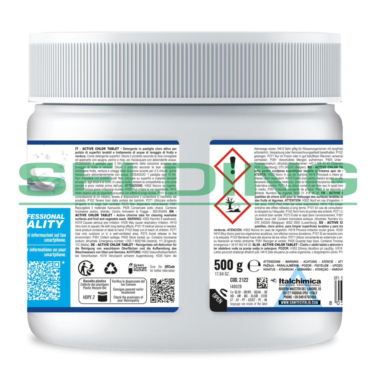 Iepakojums: 500gr (150 tabletes), pH 7. Tabletes izgatavotas no koncentrēta, dezinficējoša, mazgājoša un dezodorējoša aktīvā hlora visa veida mazgājamām virsmām. Izmantošana: visa veida grīdas, mazgājamas virsmas, trauku mazgājamās mašīnas, veļas mazgājamās mašīnas, virtuves, vannas istabas un tualetes, tvertnes un pārtikas rūpniecības uzņēmumos, slimnīcās un restorānos. Lietošana: lietošana ir atkarīga no izmantošanas veida, izšķīdiniet tabletes siltā ūdenī. Veļasmašīnās un trauku mazgājamās mašīnās ievietojiet tableti mazgāšanas līdzekļa dozatorā. Rūpīgi izskalojiet pēc lietošanas. Dozēšana: 1 tablete/ 3L ūdens. Tikai profesionālai lietošanai. Atbilst H.A.C.C.P. (apstiprināts izmantošanai PĀRTIKAS jomā).