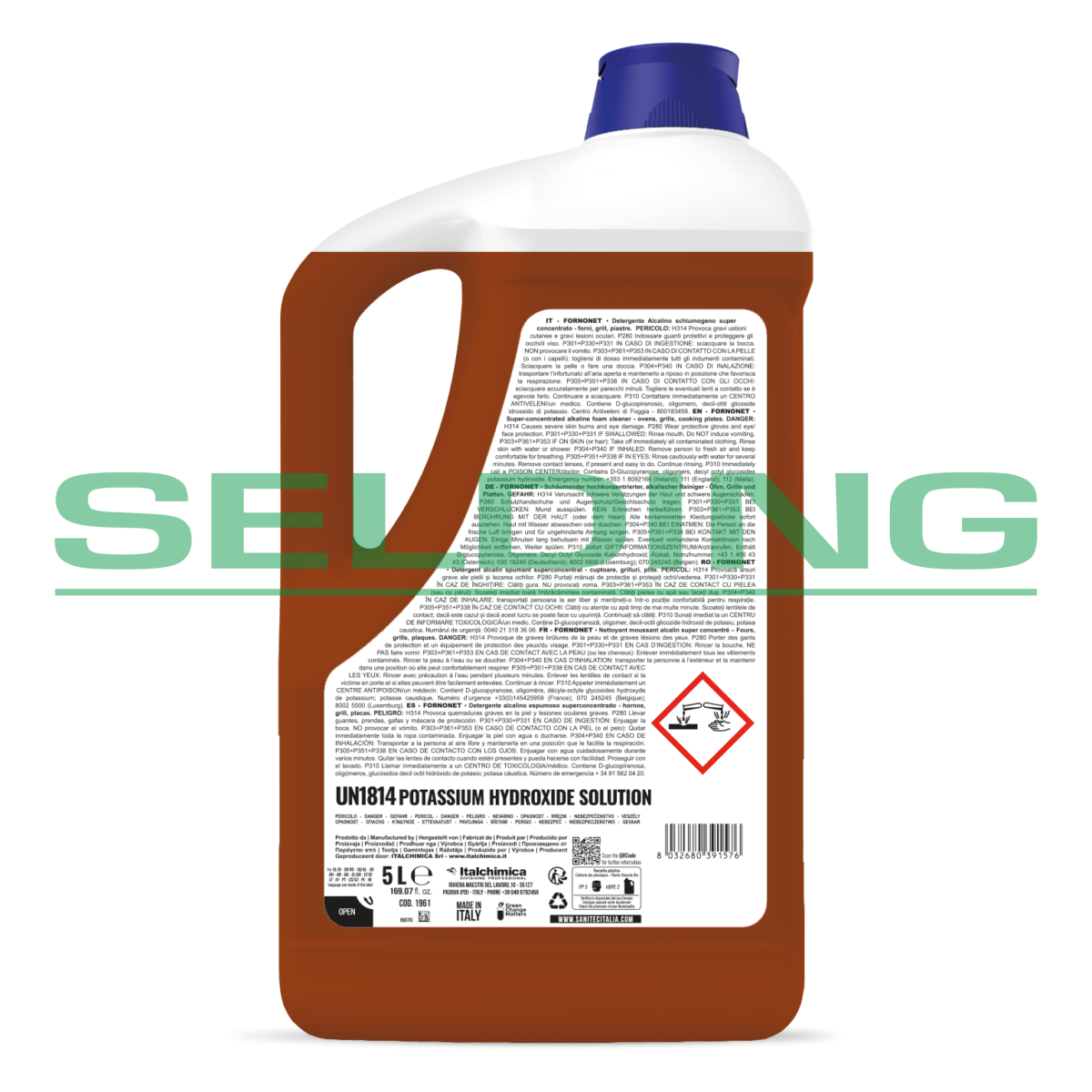 Iepakojums: 5L, pH 13,5. Gatavs lietošanai. Īpaši koncentrēts sārmains putojošs mazgāšanas līdzeklis – krāsnīm, griliem, plītīm. Sārmains tīrīšanas līdzeklis, kas paredzēts tauku un piedegušas pārtikas atlieku noņemšanai. Rada blīvas putas, kas turas pie vertikālām sienām, nodrošinot vēl lielāku efektivitāti grūtāk sasniedzamās vietās. Lietošana: cepeškrāsnis, tvaika nosūcēji, grili, plītis, restes, iesmi, barbekjū, kamīnu stikls u.c. Nelietot vara, misiņa, alumīnija vai gumijas piederumu tīrīšanai. Izsmidziniet neatšķaidītu produktu uz tīrāmām virsmām, ļaujiet dažas minūtes iedarboties, pēc tam noslaukiet ar abrazīvu sūkli. Lai iegūtu vēl labāku rezultātu, izmantojiet uz virsmām, kas joprojām ir siltas (50–60°C). Pārliecinieties, ka apstrādājamās virsmas temperatūra nepārsniedz 80 °C. Atbilst H.A.C.C.P.