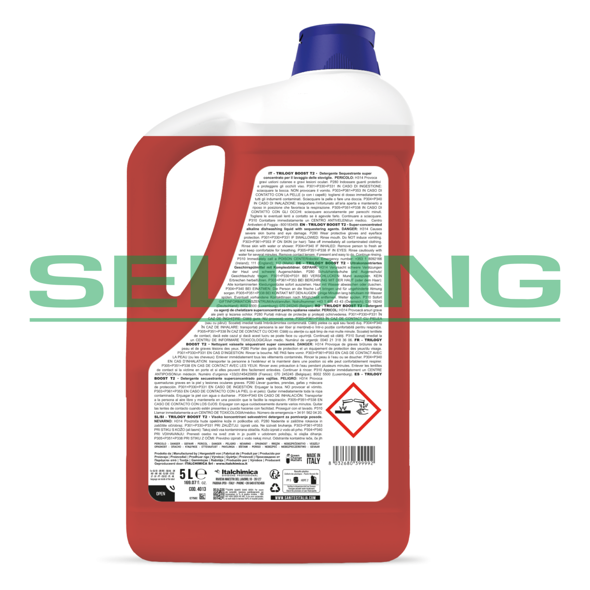 Iepakojums: 5L. pH 12,5. Īpaši koncentrēts trauku mazgāšanas līdzeklis ar sekvestrantu. Sekvestranta viela ļauj izvairīties no kaļķakmens rašanās mazgāšanas laikā. Līdzekli izmanto kopā ar Trilogy Wash T1 un Trilogy Rinse T3 līdzekļiem. Atsevišķie komponenti ļauj optimizēt dozēšanu un kalibrēt to atbilstoši ūdens cietībaas un netīrības pakāpei. Tikai profesionālai lietosanai. Nesatur fosforu un EDTA. Produkts nesatur virsmaktīvās vielas. Atbilst H.A.C.C.P. (apstiprināts izmantošanai PĀRTIKAS jomā).