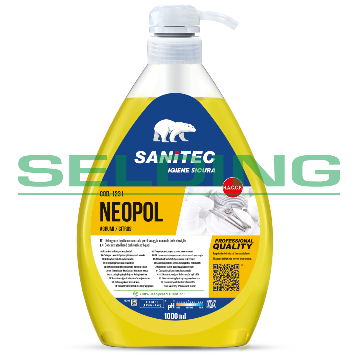 Iepakojums: 1L, pH 7. Aromāts: citrusa. Ar spēcīgu attaukošanas iedarbību. Emuļģē taukus, noņem eļļas un ēdiena paliekas. Saudzīgs rokām. Dozators, kas nodrošina pareizu daudzumu padevi un ļauj izvairīties no līdzekļa izšķērdēšanas. Atbilst H.A.C.C.P. (apstiprināts izmantošanai PĀRTIKAS jomā).